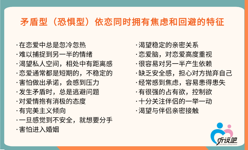 长大后矛盾型依恋者兼具焦虑型和回避型的特点,具有分裂、混乱的特质,他们对于亲密关系始终抱着一种质疑和不信任的态度,内心非常矛盾,情绪在焦虑和回避之间不停波动,时而热情似火,时而冷若冰霜。